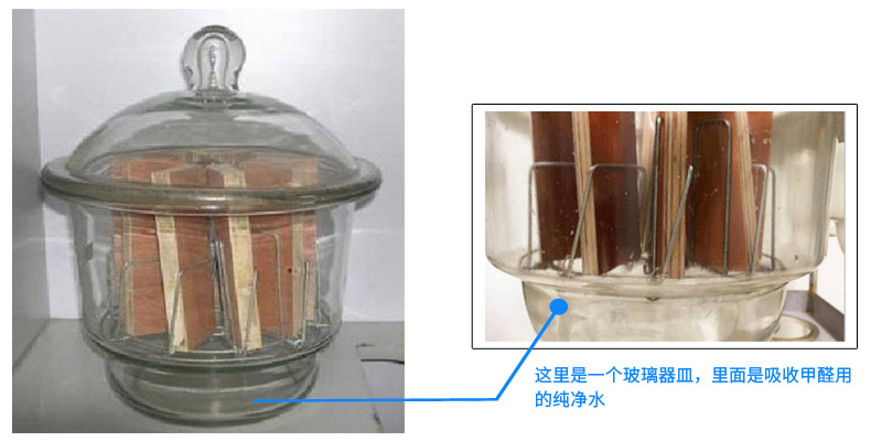 你看看上面那張表,表中的《人造板及其制品用甲醛清除劑清除能力的測試方法》,這個方法是檢測人造板甲醛釋放量方法,專業(yè)上稱之為“干燥器法”。就是把10塊切割成15cm×5cm的人造板,放到這個10升的玻璃容器里,密閉24小時。24小時中,人造板不停地釋放甲醛,在玻璃容器的底部,放著一個盛著純凈水的玻璃器皿,人造板釋放出來的甲醛被吸收在水中,然后檢測水中的甲醛,所得數值就是人造板甲醛釋放量。